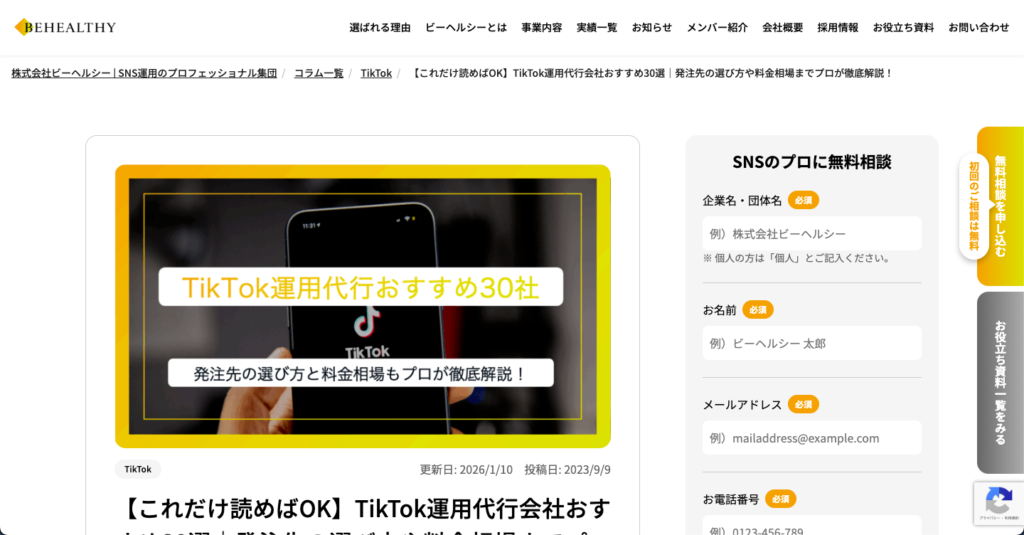 2026/01/14 株式会社ビーヘルシーのメディアにて弊社のTikTok運用代行サービスをご紹介いただきました。 掲載ページはこちら:【これだけ読めばOK】TikTok運用代行会社おすすめ30選|発注先の選び方や料金相場までプロが徹底解説!